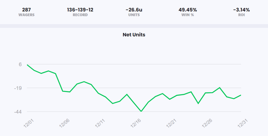 | 12/28 | NBA | DET @ ATL | 3 units on DET +10 | -105 | W | +2.86u |